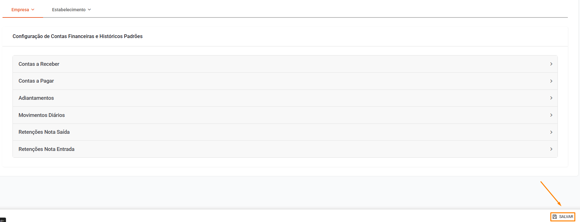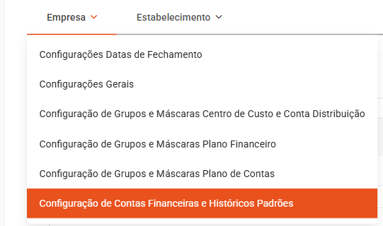 No menu lateral, acesse: Empresa > Configuração de Contas Financeiras e Históricos Padrões.