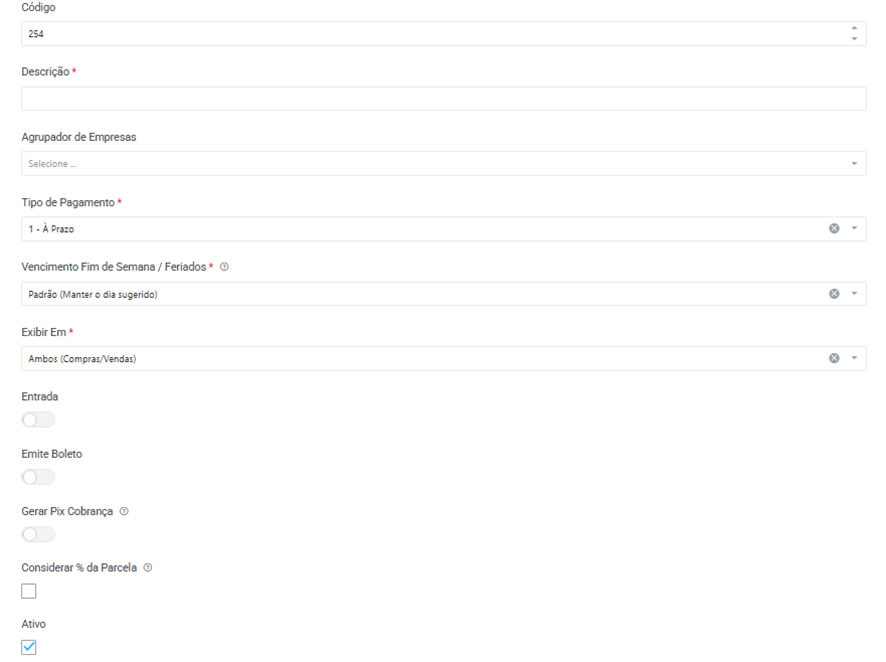 Preencha os seguintes campos para fazer o cadastro de uma condição de pagamento a prazo: