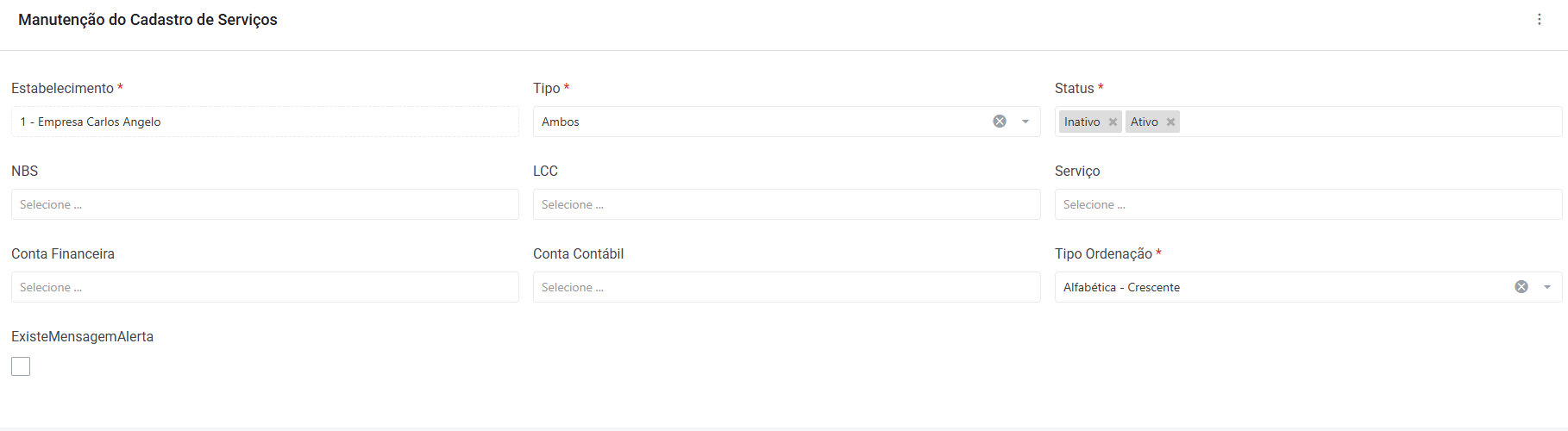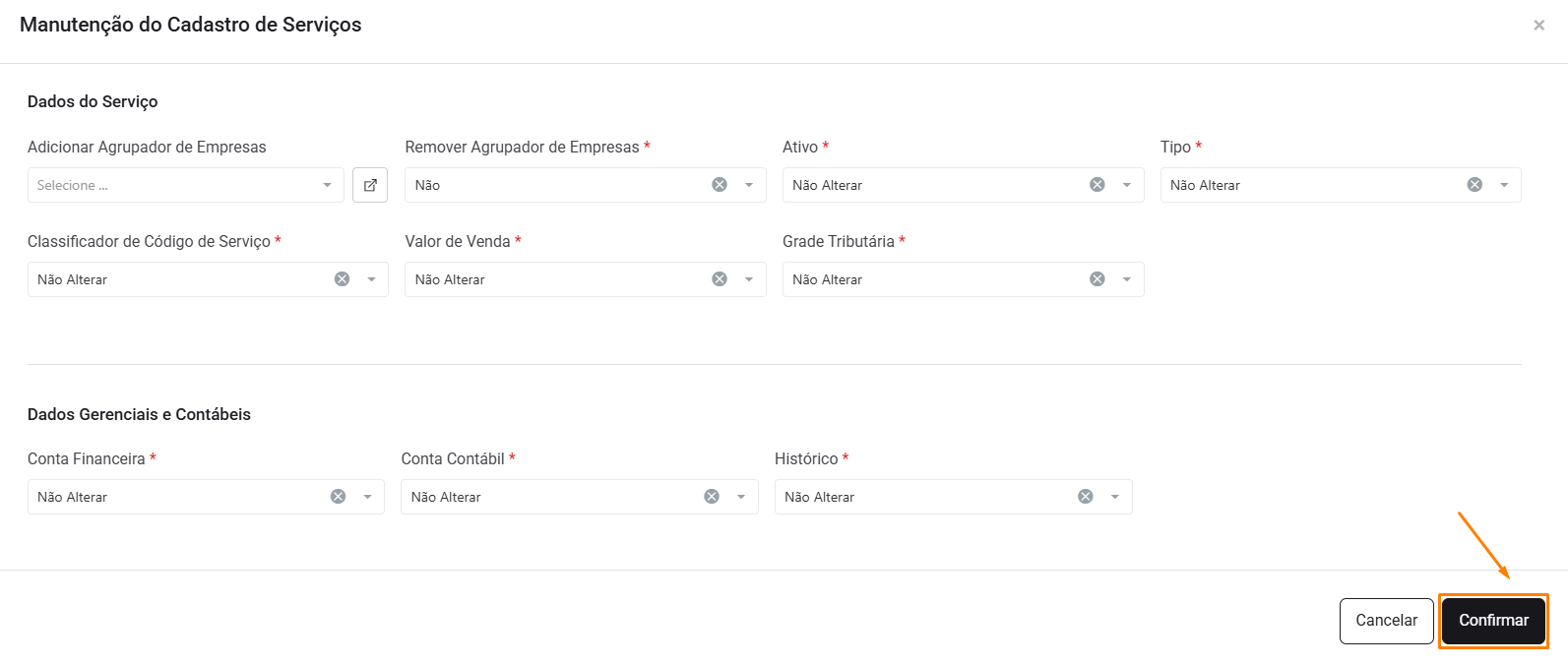 Esta rotina é utilizada para modificar informações no cadastro dos serviços, permitindo a alteração de diversos serviços em uma única operação de manutenção.