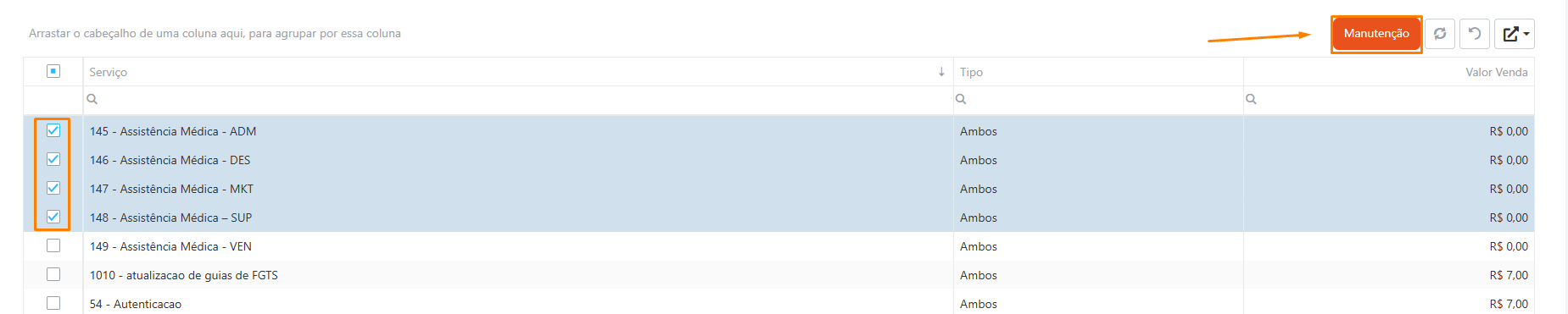 Marque os serviços desejados e clique em “Manutenção” para realizar o processo.