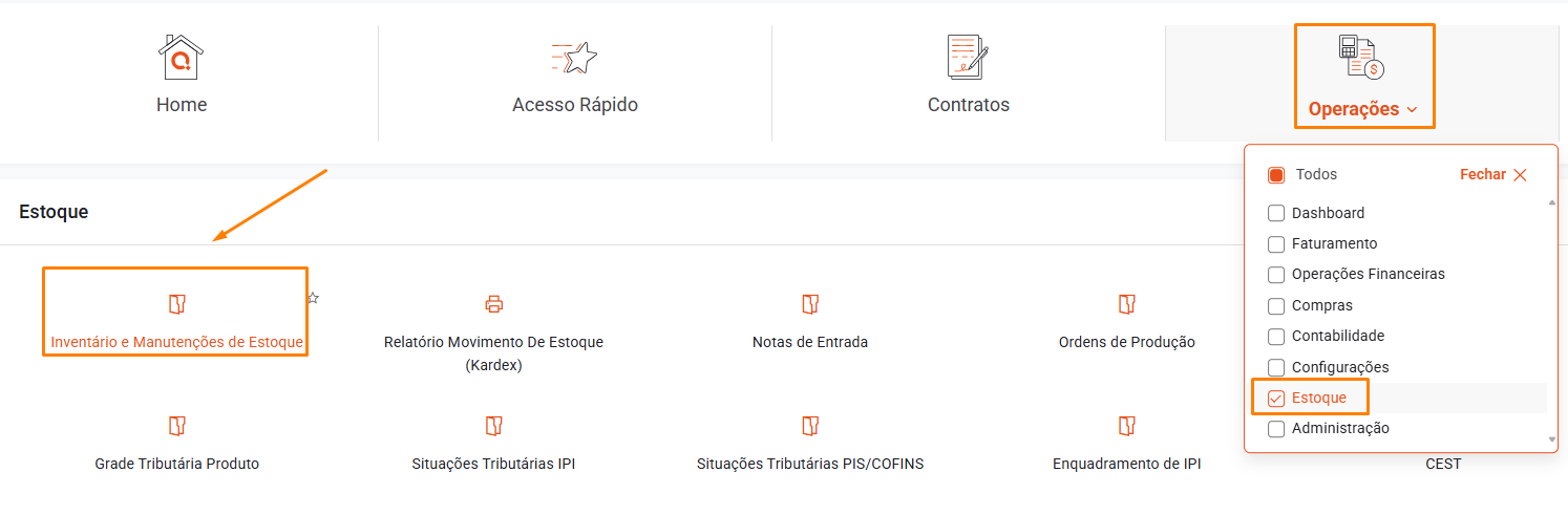 Acesse a rotina pelo seguinte caminho: Operações> Estoque> Inventário e Manutenções de Estoque.