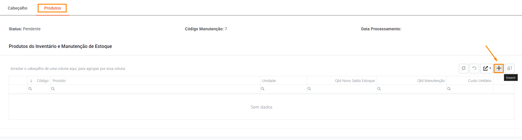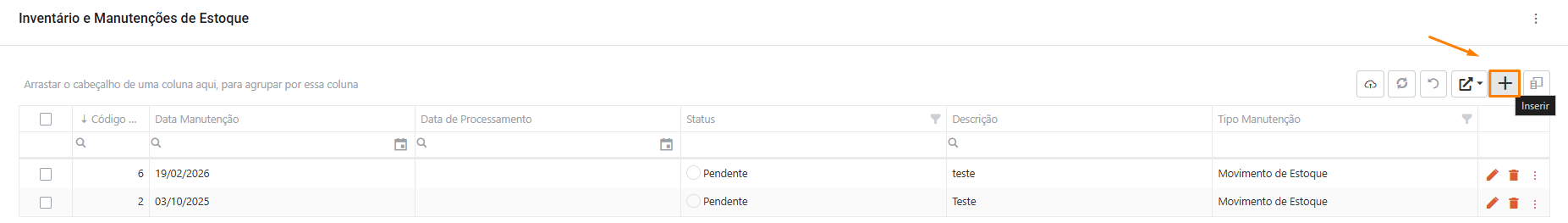 Após acessar a rotina “Inventário e Manutenções de Estoque”, clique no ícone de “Inserir”.