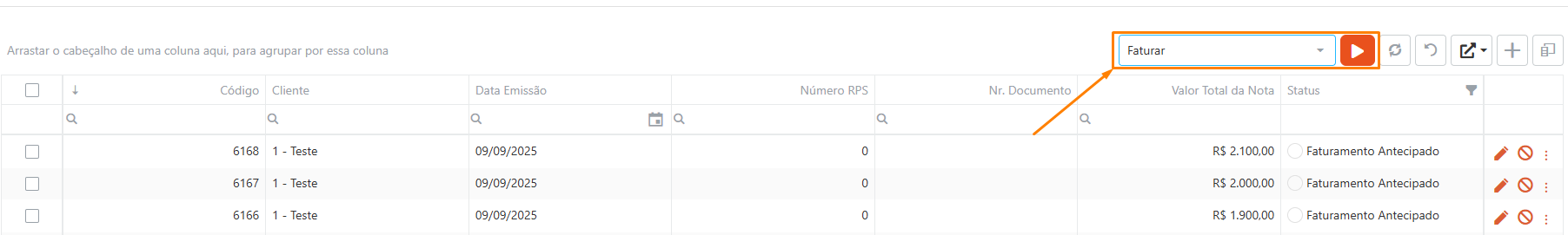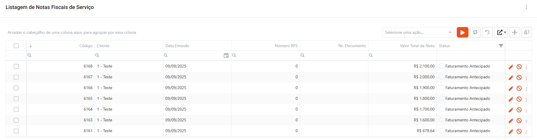 Ao selecionar a opção “Gerar Faturamento Antecipado”, as NFSe serão incluídas na listagem de Notas Fiscais de Serviço com o status “Faturamento Antecipado”.