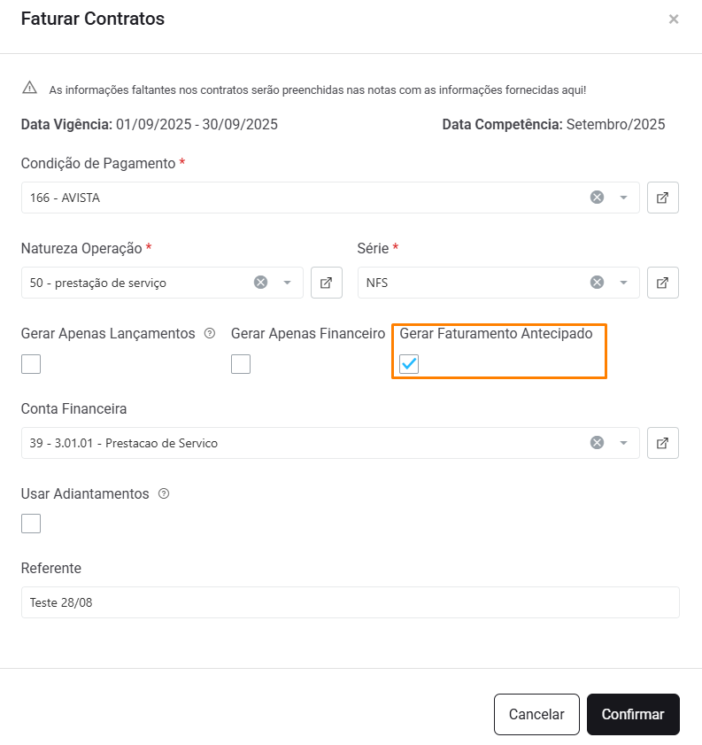 O sistema vai mostrar uma tela para preencher informações que faltam no cadastro de contratos. Marque a opção “Gerar Faturamento Antecipado” e clique em “Confirmar” para realizar o faturamento.