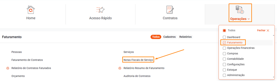 Para configurar pela rotina de notas fiscais, acesse a rotina pelo seguinte caminho: Operações > Faturamento > Notas Fiscais de Serviço.