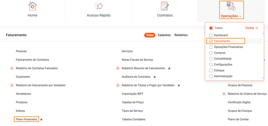 Para fazer a vinculação da conta acesse o menu: Operações > Faturamento > Plano Financeiro.
