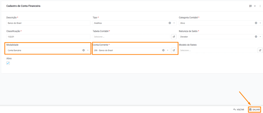 A modalidade da conta deve estar como Conta Bancária. A conta deve ser selecionada no campo Conta-corrente, conforme a imagem abaixo: