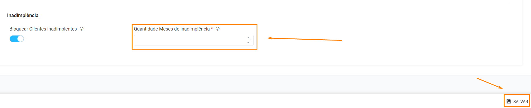 Após marcar a opção de Bloquear Clientes Inadimplentes, o campo Quantidade Meses de Inadimplência é habilitado. Nele, você deve informar após quantos meses de parcelas vencidas o cliente será considerado inadimplente para fins de bloqueio automático.