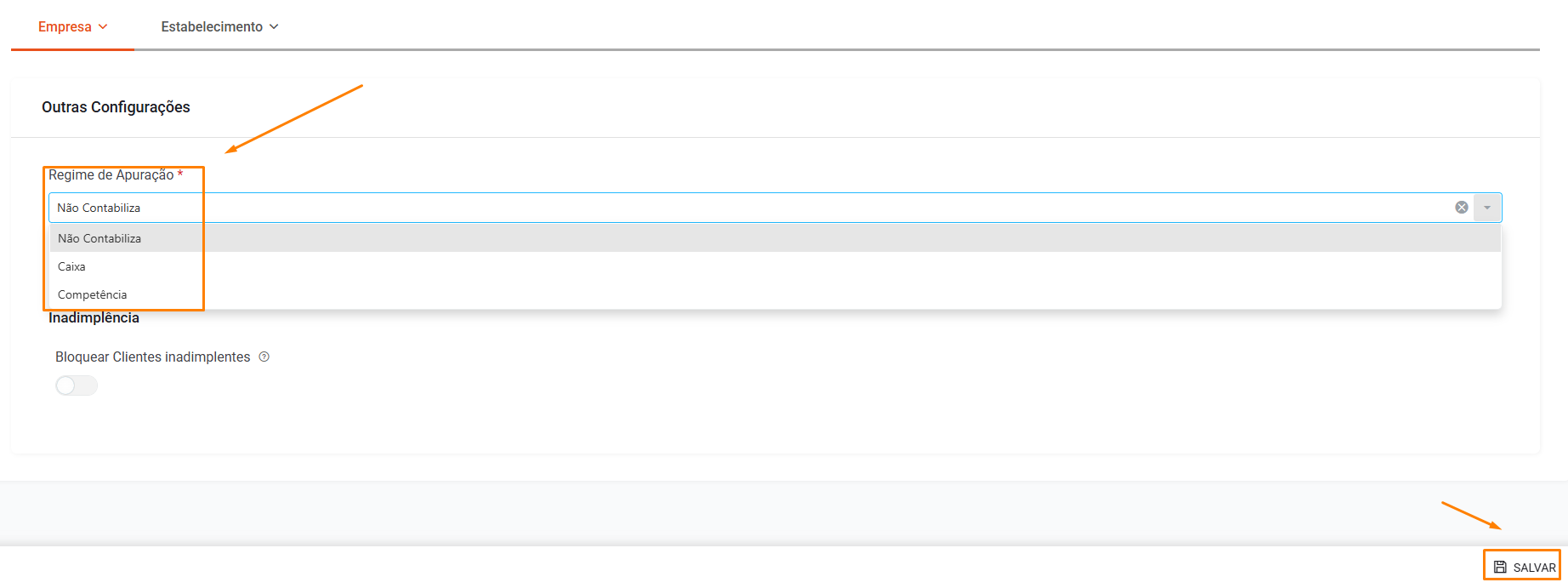 3° Passo - Na tela exibida, você poderá configurar o Regime de Apuração da empresa. No campo destacado em laranja, é possível selecionar entre as opções: