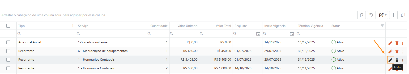 Também é necessário verificar se os serviços cadastrados nos contratos estão ativos para que o adicional anual seja gerado corretamente.