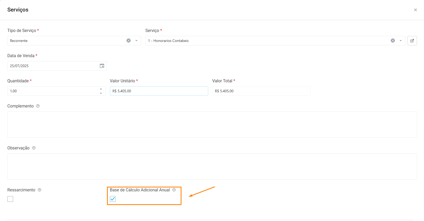Mantenha a opção de "Base de Cálculo Adicional Anual" marcada conforme a imagem, para que o adicional anual considere este serviço.