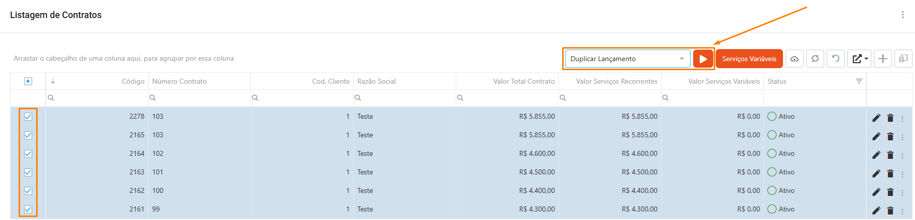 Serão exibidos todos os contratos cadastrados, onde você poderá duplicar os existentes. Marque os contratos que deseja duplicar, selecione a opção "Duplicar Lançamento", e clique no Botão de Ação para duplicar os registros.