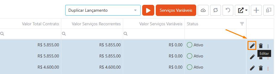 Após duplicar o lançamento, edite o lançamento clicando no ícone de edição.