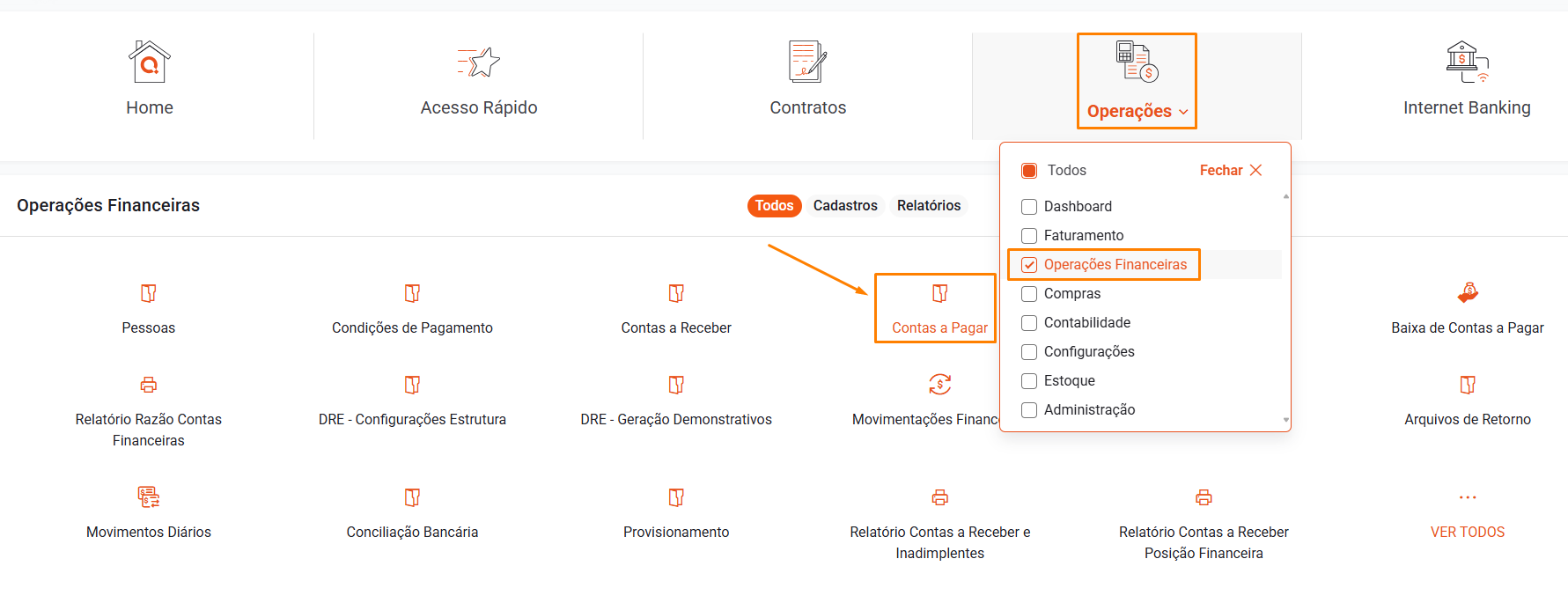 Acesse a rotina pelo seguinte caminho: Operações > Faturamento > Contas a Pagar.