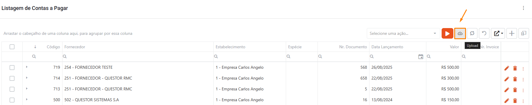 Serão exibidos todos os lançamentos cadastrados, clique na opção "Upload".