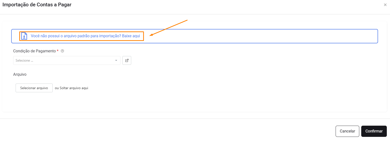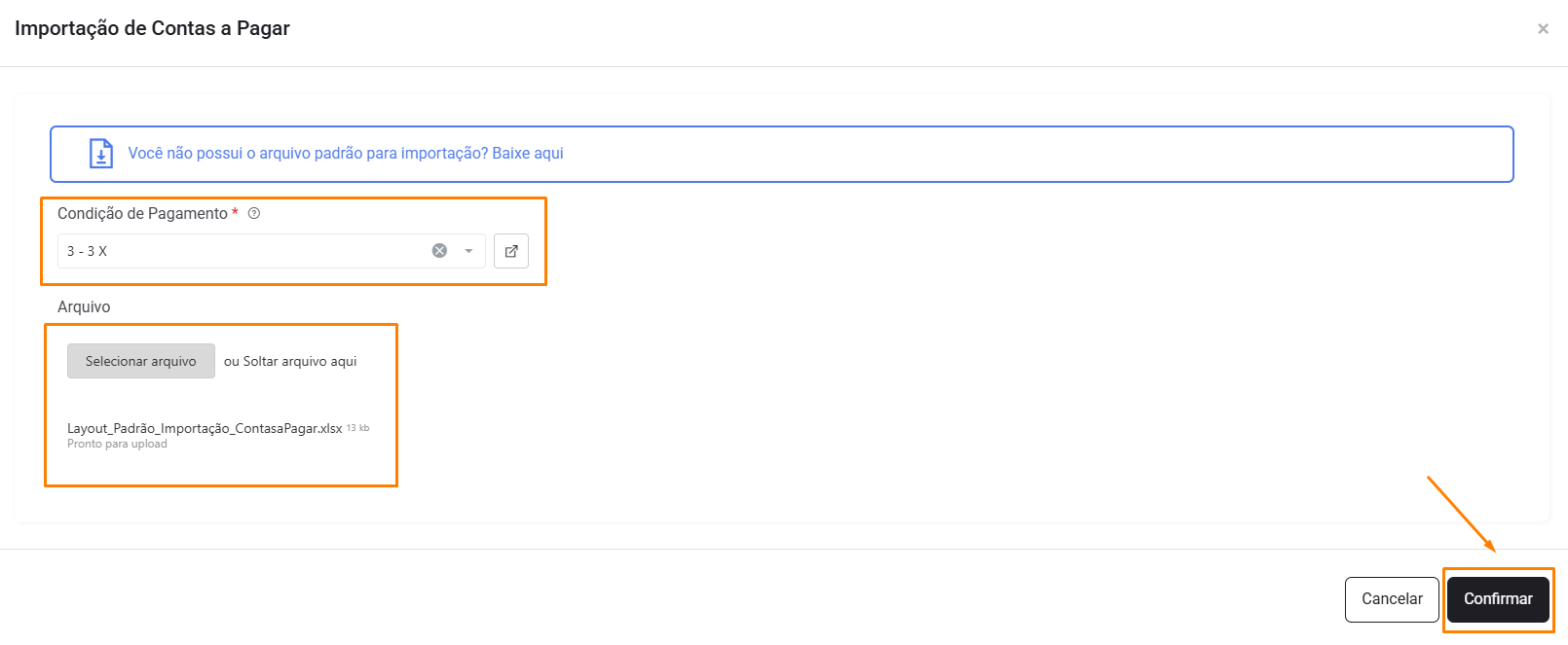Após preencher os campos necessários e salvar a planilha, Selecione o Arquivo e Condição de Pagamento, clique em “Confirmar”.
