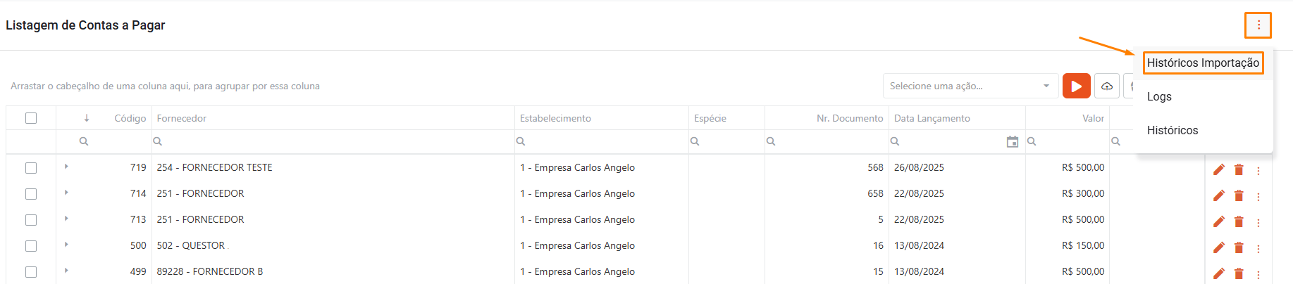 Para verificar os motivos da rejeição e identificar possíveis erros acesse: Ícone de Três Pontos > Históricos Importação.