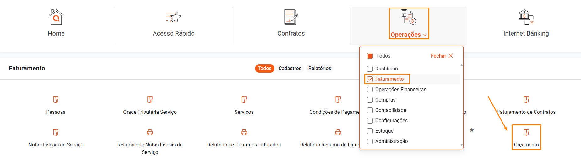 Acesse a rotina pelo seguinte caminho: Operações > Faturamento > Orçamento.