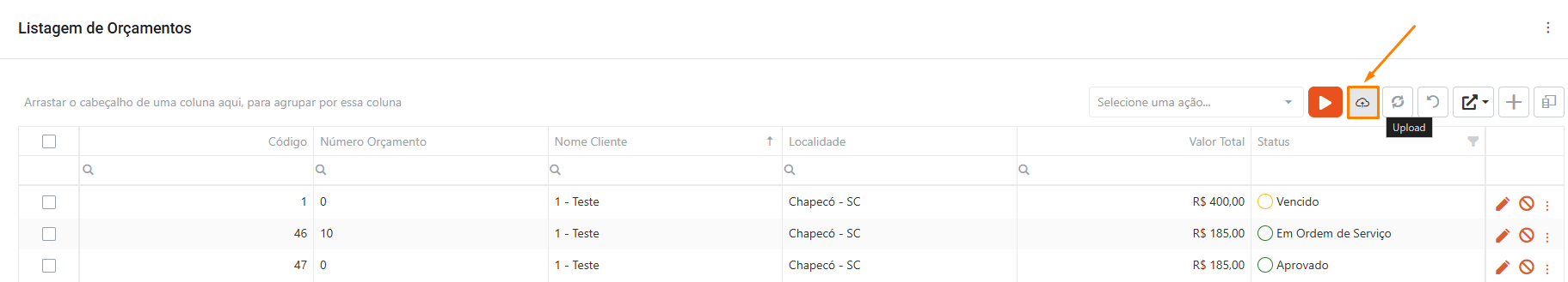Serão exibidos todos os lançamentos cadastrados, clique na opção "Upload".