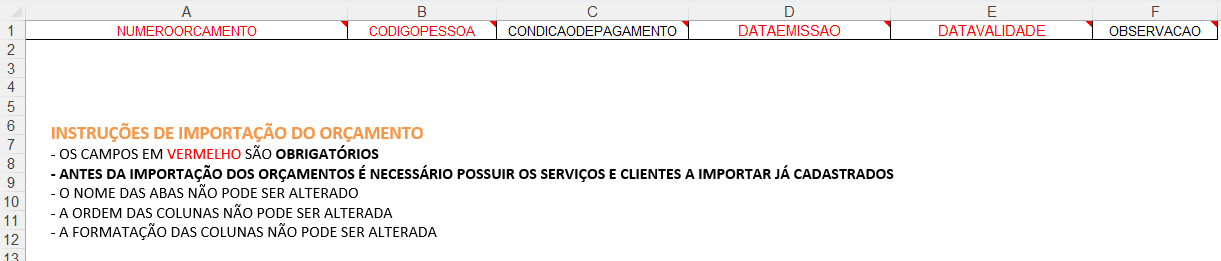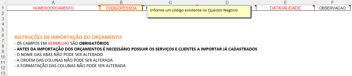 Passe o mouse sobre a célula para visualizar as instruções de preenchimento de cada coluna. Caso os dados não sejam informados conforme as regras indicadas, a importação não será concluída.