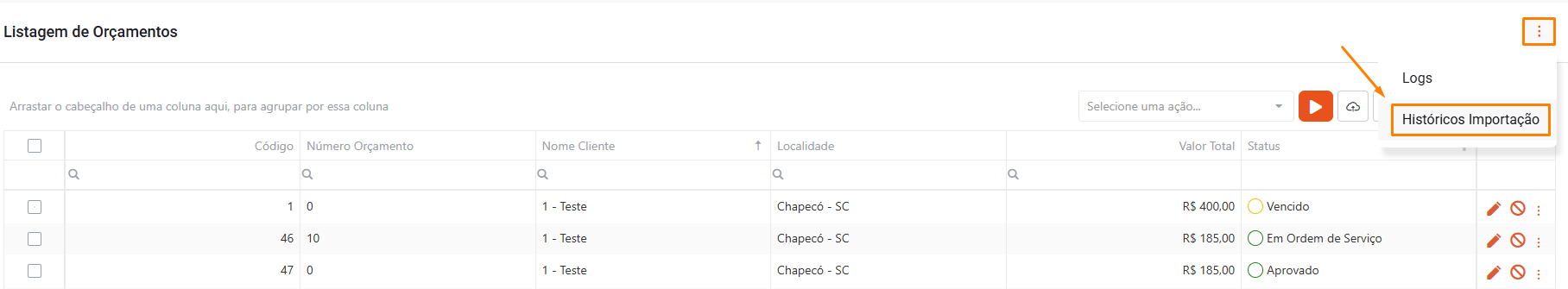 Para verificar os motivos da rejeição e identificar possíveis erros acesse: Ícone de Três Pontos > Históricos Importação.