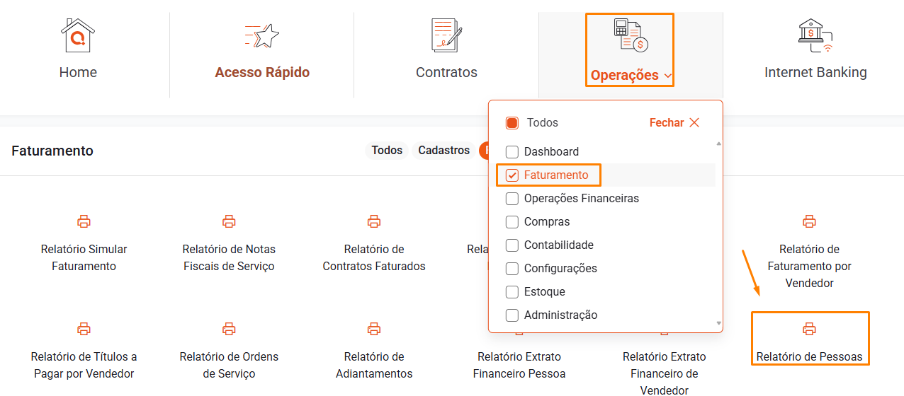 Acesse a rotina pelo seguinte caminho: Operações > Faturamento > Relatório de Pessoas.