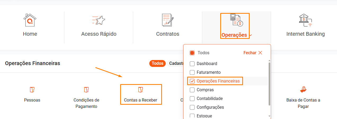 Acesse a rotina pelo seguinte caminho: Operações > Faturamento > Contas a Receber.