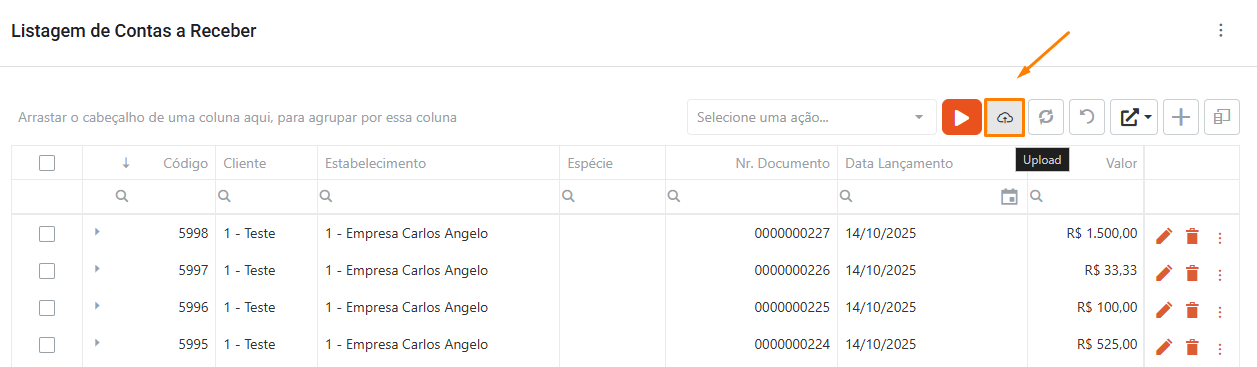 Serão exibidos todos os lançamentos cadastrados, clique na opção "Upload".