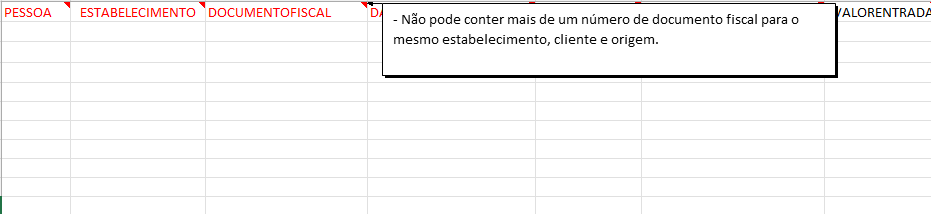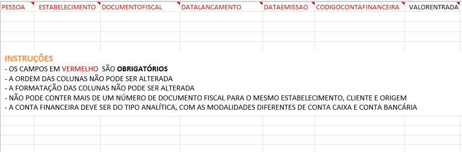Passe o mouse sobre a célula para visualizar as instruções de preenchimento de cada coluna. Caso os dados não sejam informados conforme as regras indicadas, a importação não será concluída.
