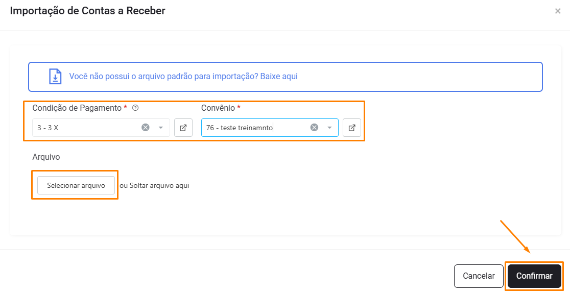 Após preencher os campos necessários e salvar a planilha, Selecione o Arquivo, Condição de Pagamento, Conta Financeira ou Convênio, e clique em “Confirmar”.