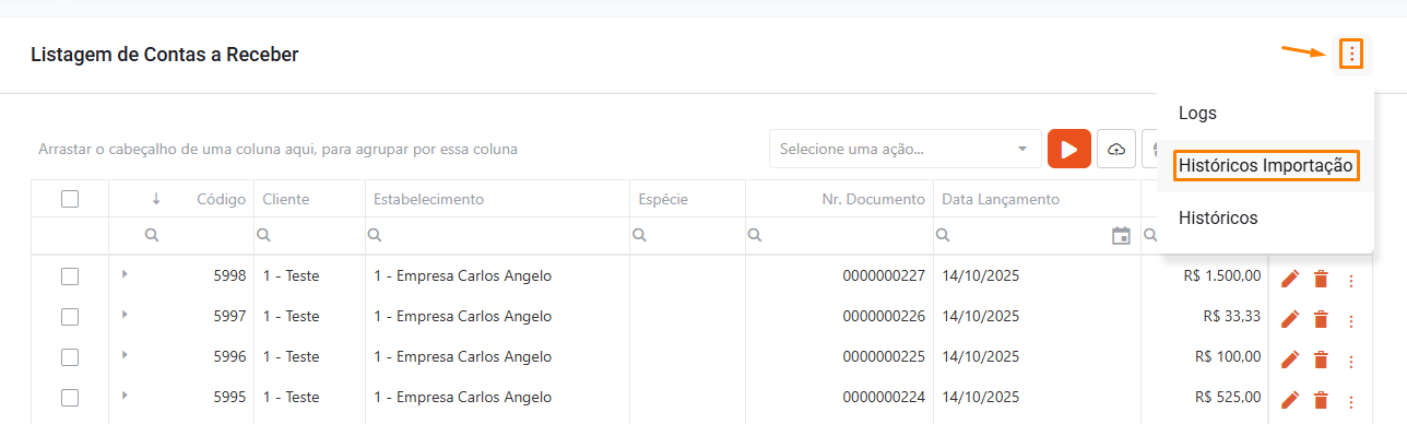 Para verificar os motivos da rejeição e identificar possíveis erros acesse: Ícone de Três Pontos > Históricos Importação.