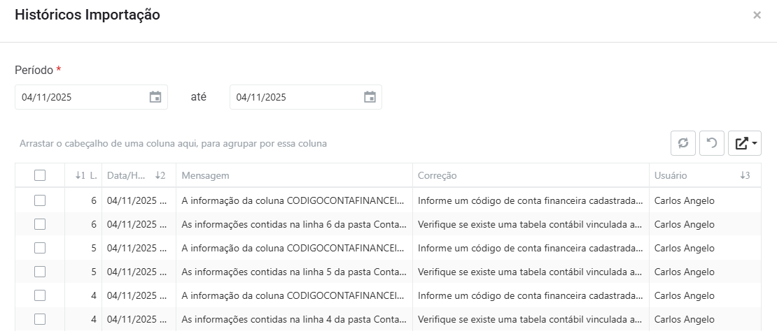 Dessa forma serão exibidas as informações da Aba do Arquivo, Linha do Arquivo, Data/Hora, Inconsistência Encontrada, Correção e o Usuário responsável, facilitando a identificação e o ajuste dos registros incorretos.