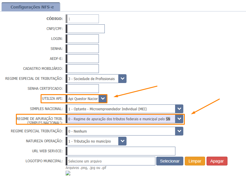 Na aba Configuração NFS-e, verifique a API disponível no município e verifique o Regime de apuração tributária necessária.