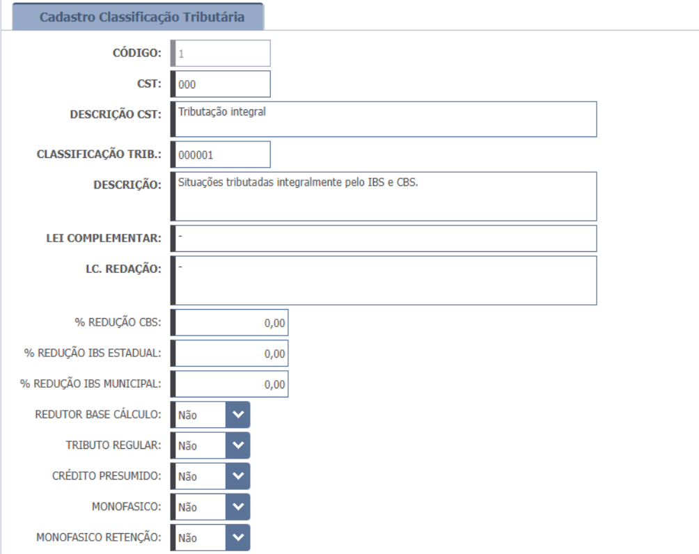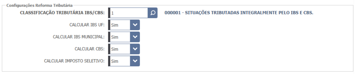 Observaçao: Em caso de redução de IBS/CBS, a aliquota de redução é configurada na tela de Classificação Tributária IBS/CBS, como mostrado acima.
