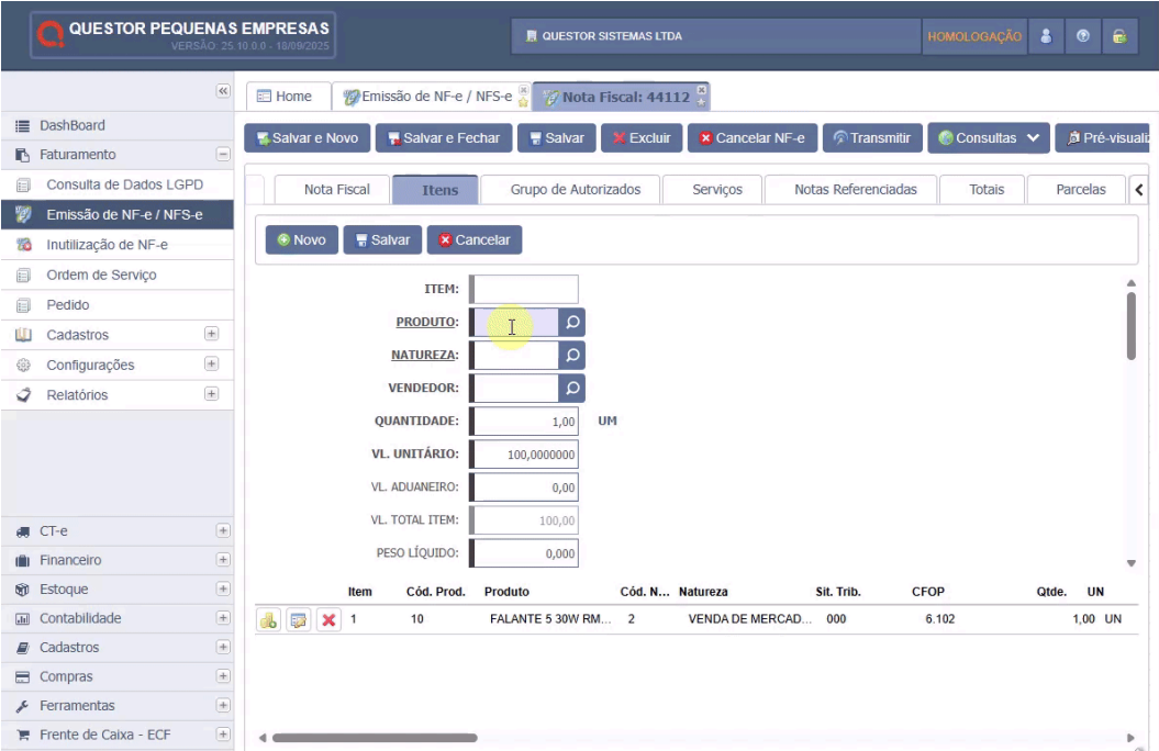Na tela de emissão de NF-e, realize o preenchimento básico do cabeçalho da nota fiscal. Em seguida, realize a inclusão dos itens e suas respectivas informações como quantidade e valores. A partir da inclusão de cada item, o sistema vai realizar a busca das informações configuradas nos passos anteriores, e vai realizar o cálculo dos novos tributos. Ao incluir todos os itens, e preencher as demais informações necessárias para a nota fiscal, faça a transmissão e aguarde a sua autorização.