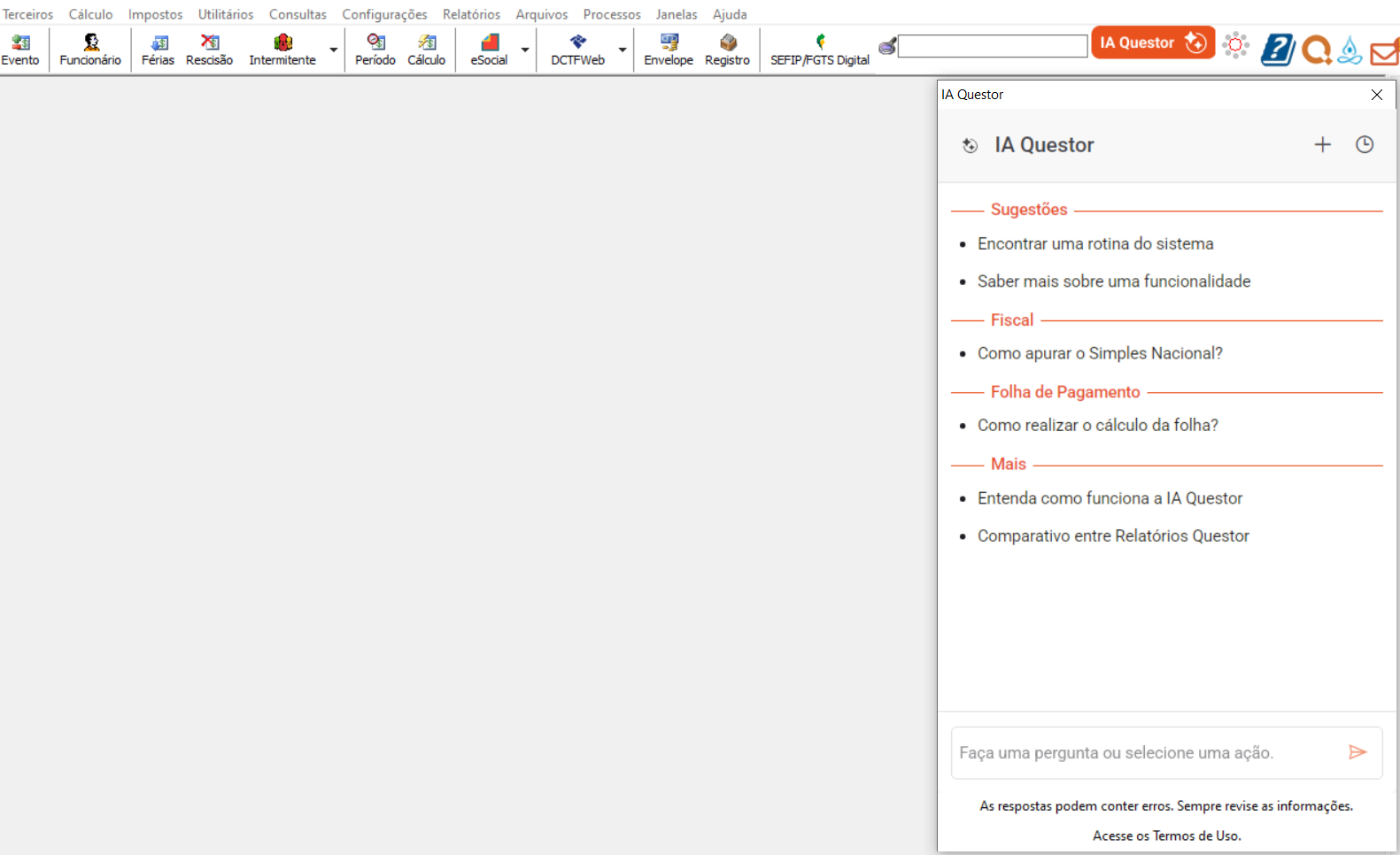 Agora disponível no Questor, a IA Questor é um assistente inteligente que “responde a dúvidas” com base na documentação oficial do sistema. Seu objetivo é proporcionar mais agilidade e autonomia no dia a dia dos usuários.