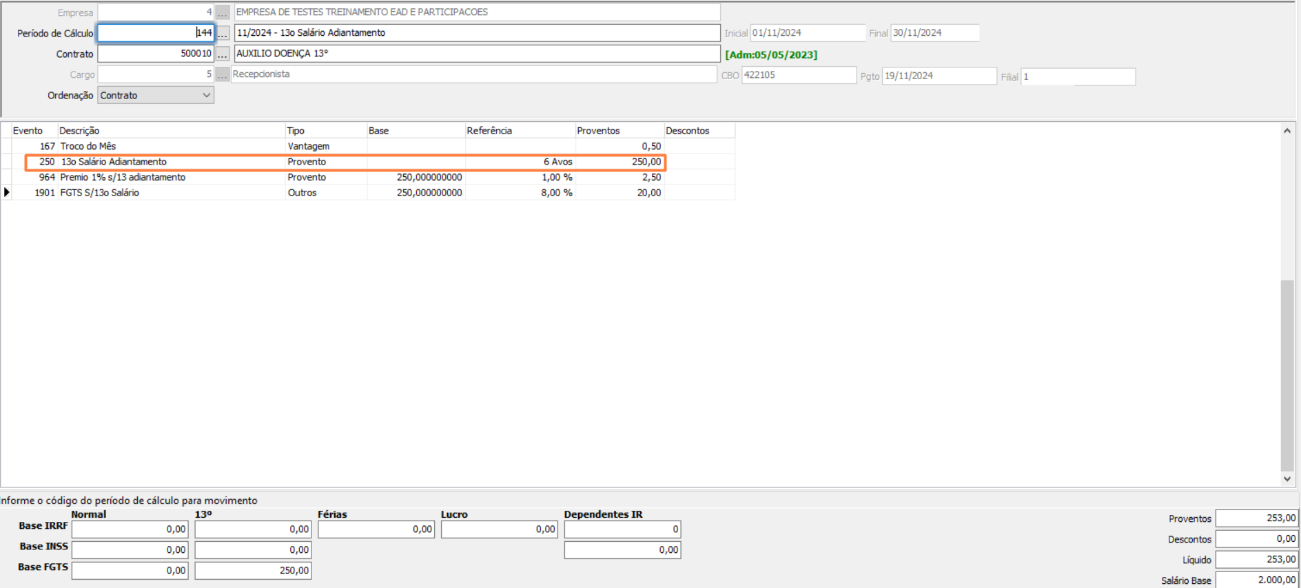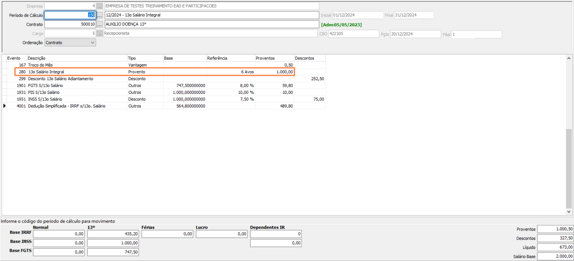 Foram considerados 6 avos no cálculo, tanto para o adiantamento quanto para o integral, enquanto os 6 meses em que o empregado permaneceu afastado são de responsabilidade do INSS e, portanto, não são gerados pela folha da empresa.