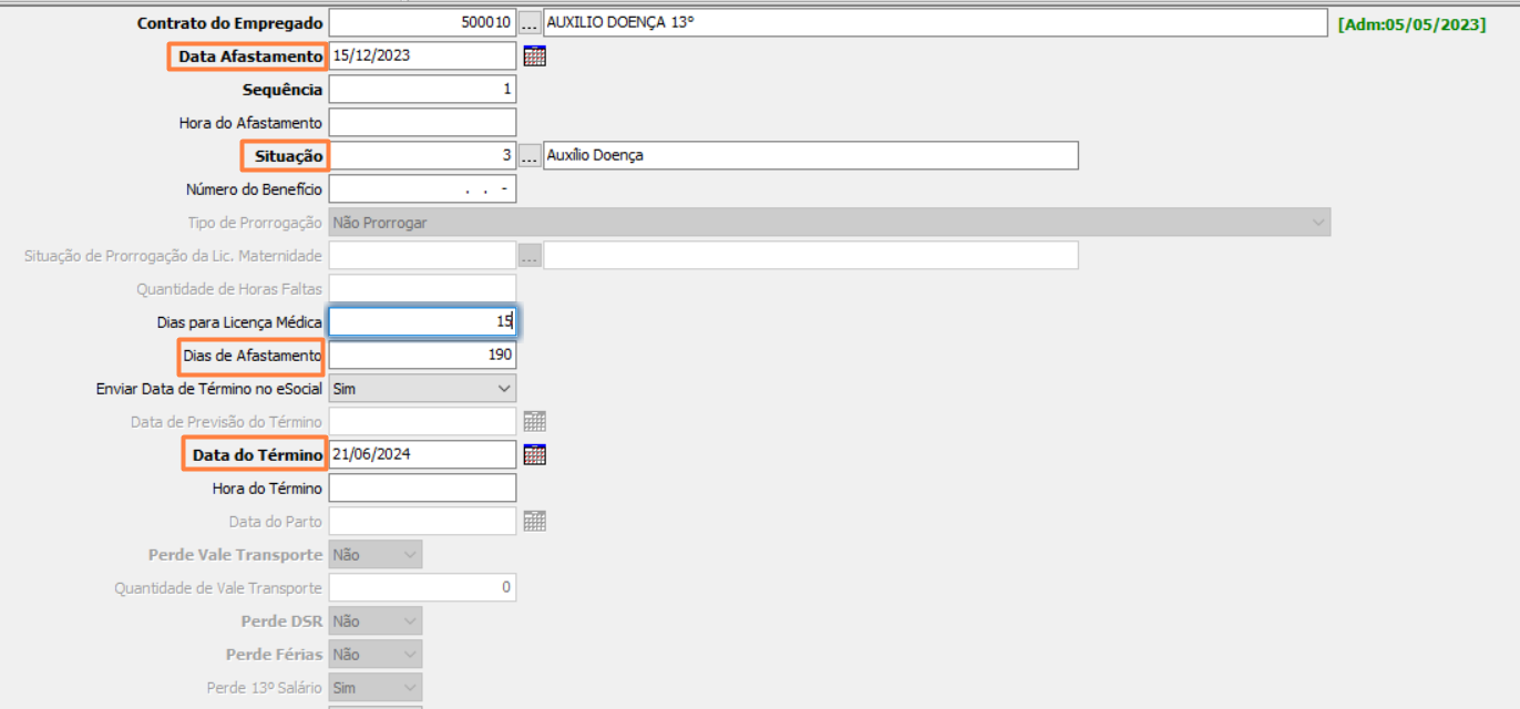 Funcionário afastado na situação Auxílio-Doença, de 15/12/2023 a 21/06/2024 (190 dias).