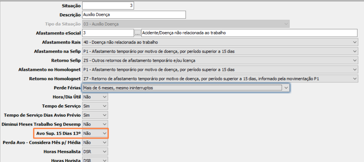 Quando o funcionário tiver afastamento por Auxílio-Doença ao longo do ano, é necessário verificar o campo Avos Sup. 15 Dias 13º no cadastro da “Situação”, acessando o menu: Cadastro > Cálculo > Situações. Esse campo deve estar configurado como Não para Auxílio Doença, pois o sistema somente irá considerar válidos os meses em que o funcionário efetivamente trabalhou.