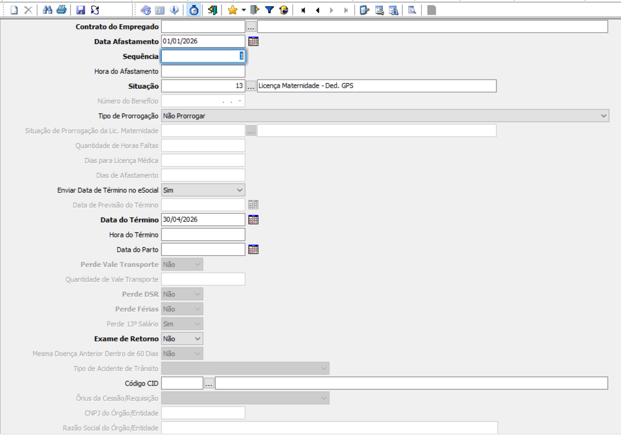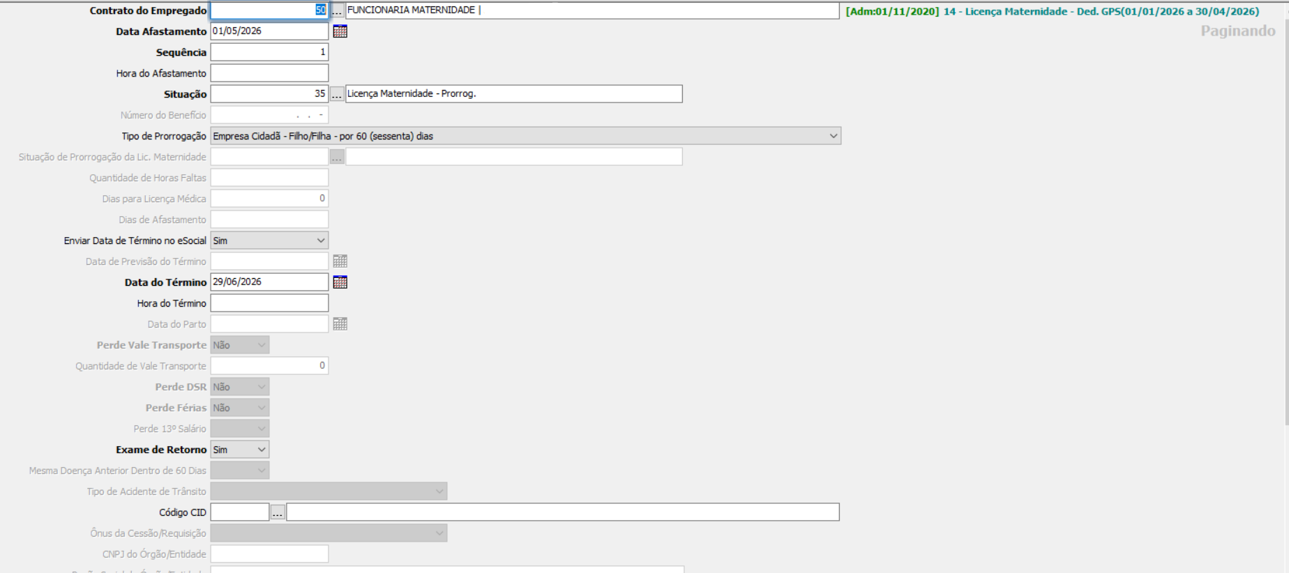 O primeiro cadastro a ser realizado é o do afastamento por licença-maternidade ou licença-paternidade. Com base nos campos preenchidos, o sistema gerará automaticamente a prorrogação do afastamento, quando aplicável.