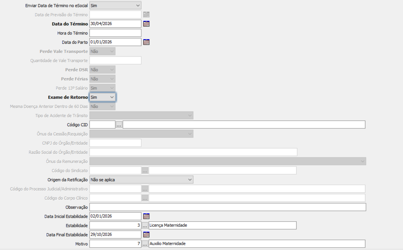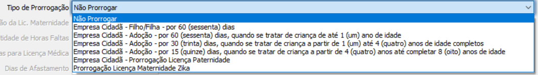 Situação de Prorrogação da Licença-maternidade/paternidade: o sistema irá gerar automaticamente conforme o tipo de prorrogação.