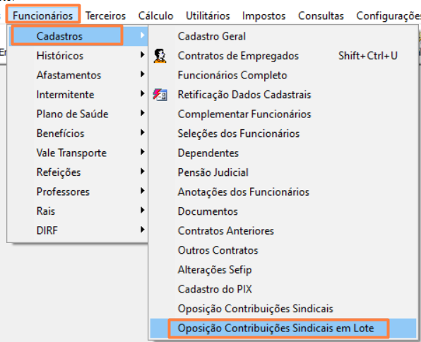 Acesse as rotinas pelo seguinte caminho: Funcionários > Cadastros > Oposição Contribuições Sindicais em Lote.