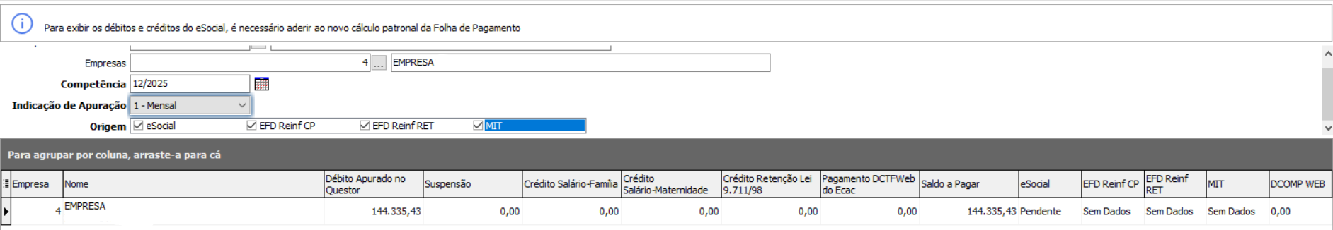 Ao aderir ao Cálculo Patronal, esta rotina passa a apurar os Encargos e Débitos Federais, conforme demonstrado no eSocial.