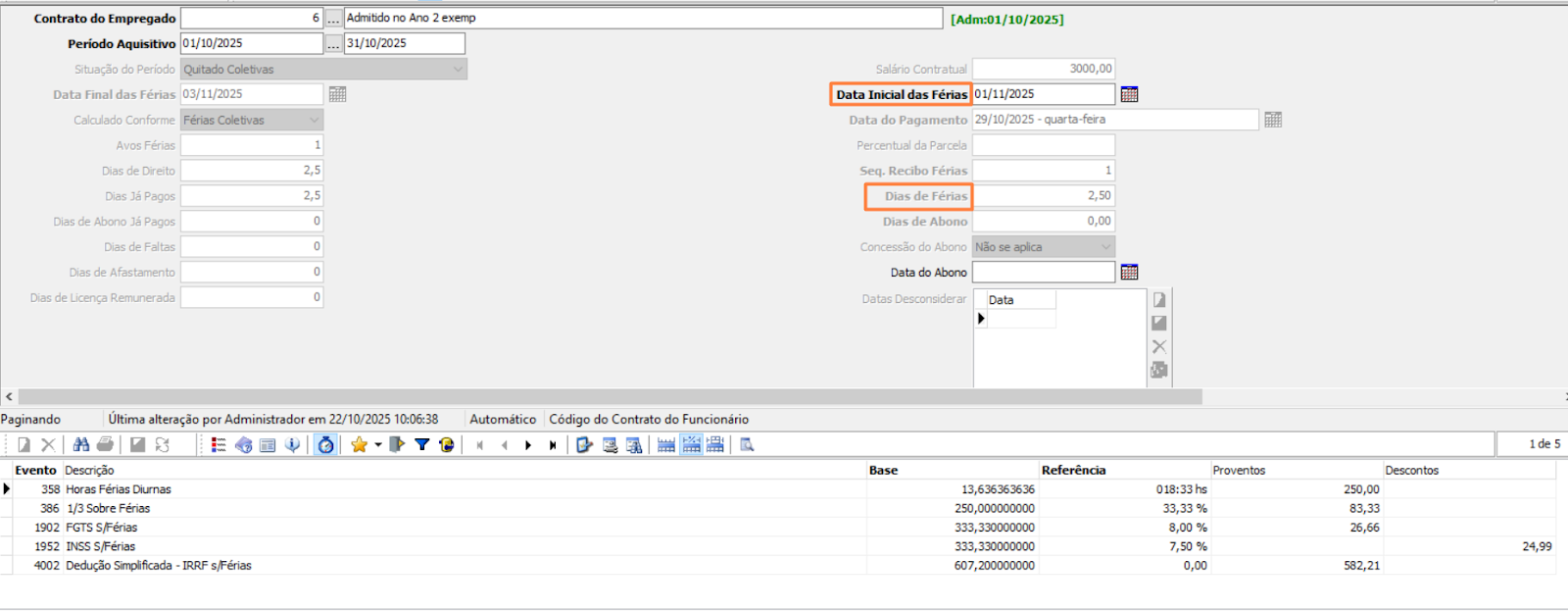 O período aquisitivo foi ajustado com data final um dia antes do início das férias coletivas, ficando com situação “Quitado por Coletivas”.
