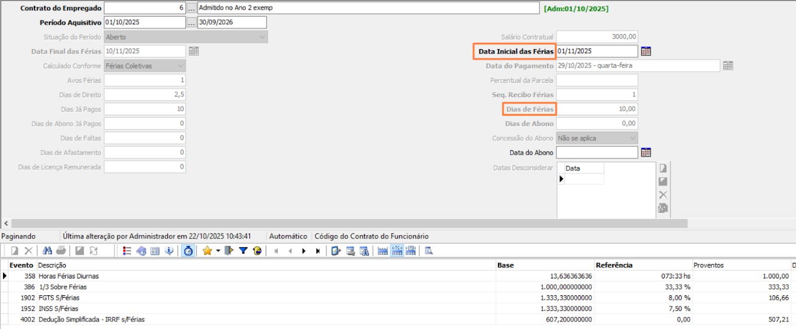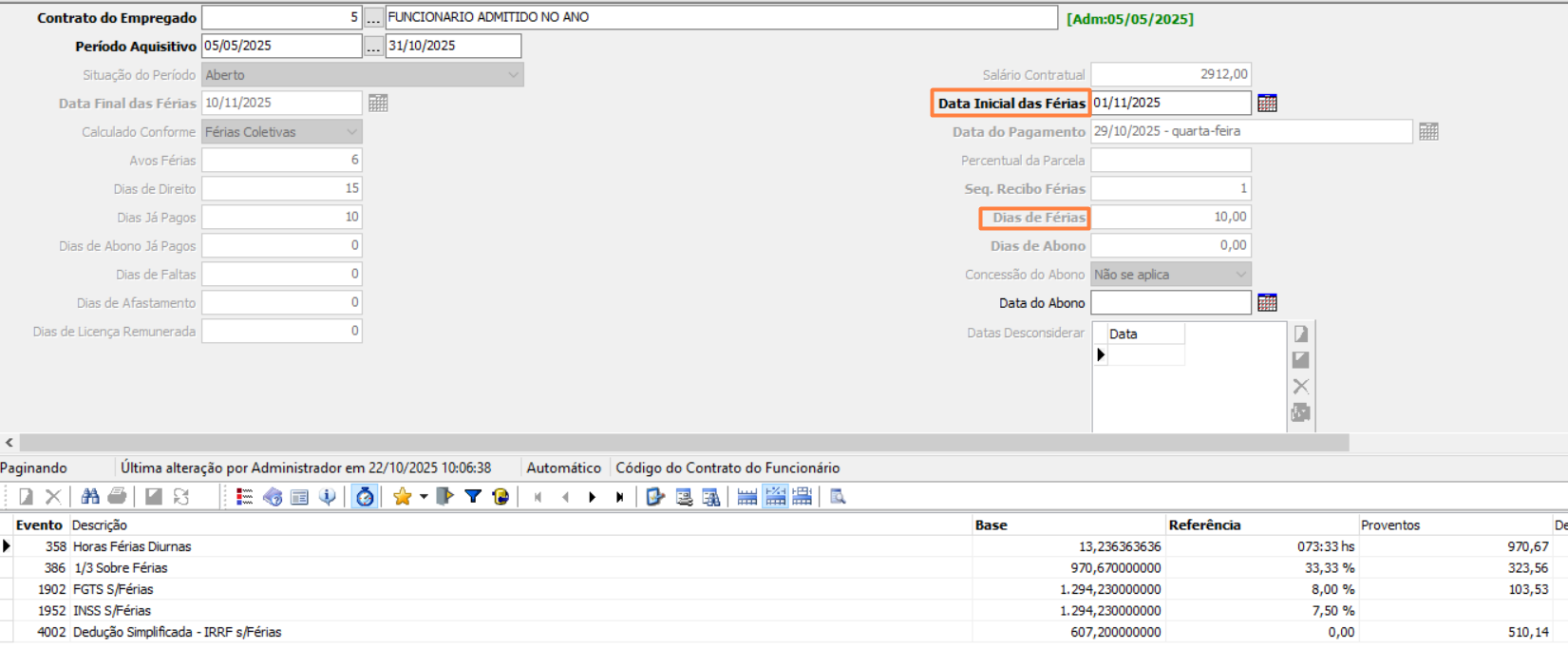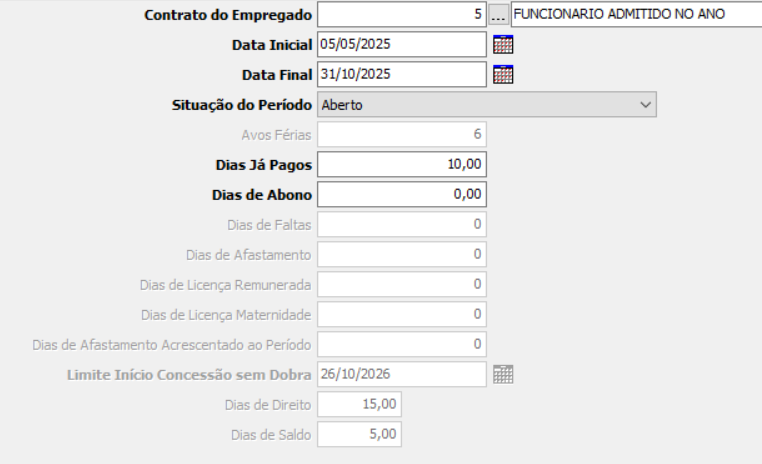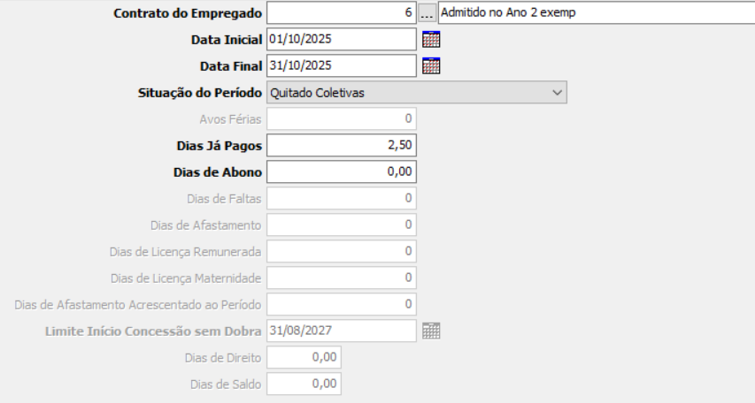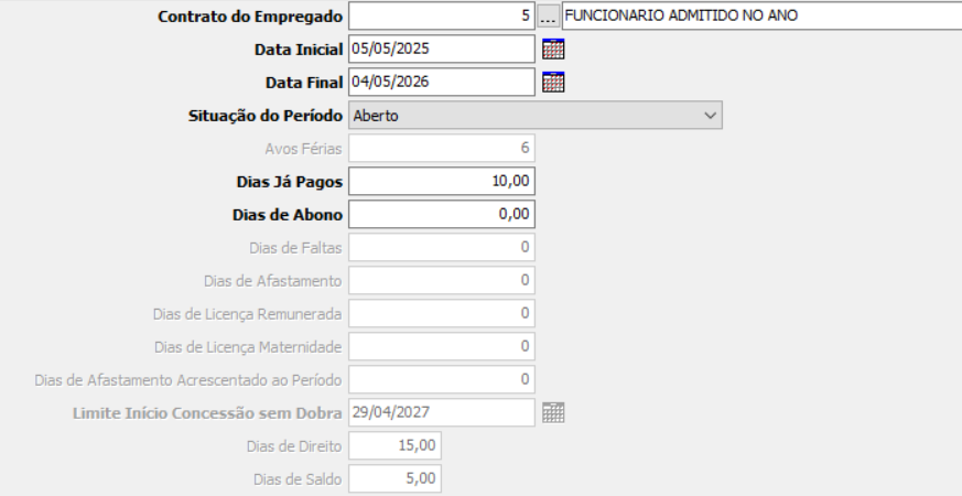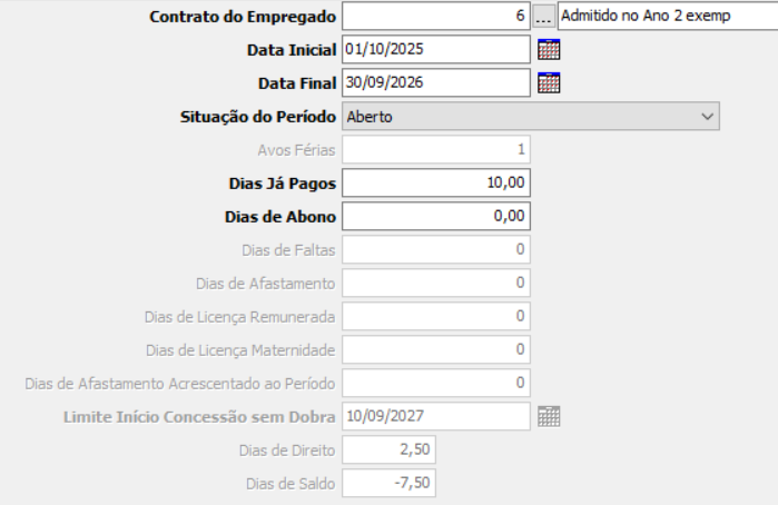 O período aquisitivo permanece inalterado, porém apresenta saldo de dias negativo, que será revertido conforme o funcionário acumular novos dias de direito.