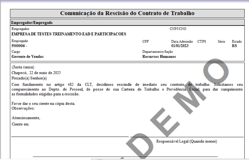 A Comunicação de Rescisão por Justa Causa pode ser emitida acessando o seguinte caminho no sistema: Área de Trabalho de Rescisão > Relatórios > Pedido de Demissão > Comunicação de Rescisão por Justa Causa.