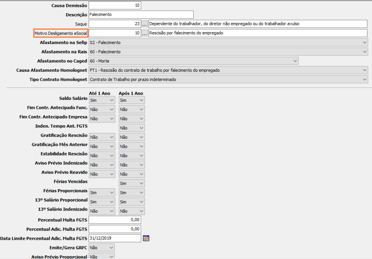 É possível consultar as causas de demissão disponíveis no menu: Cadastros > Cálculo > Causas de Demissão.