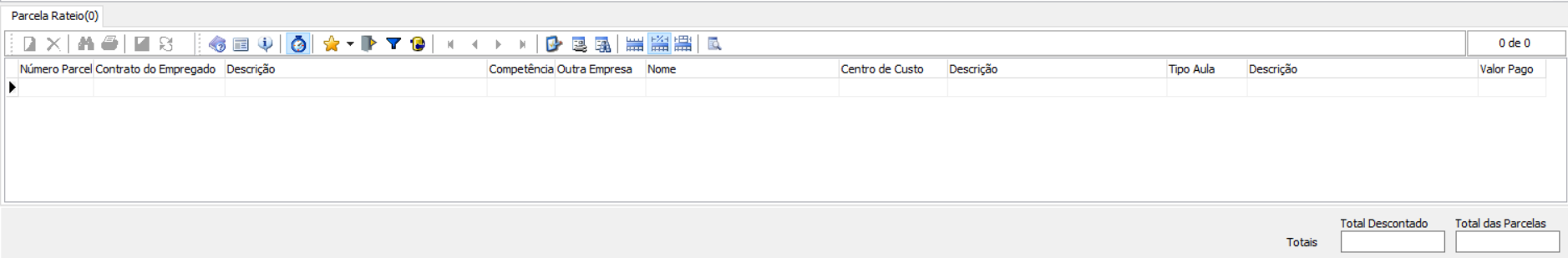 A gride “Parcela Rateio” exibe o detalhamento proporcional dos valores do Empréstimo Crédito do Trabalhador quando o empregado possui mais de uma alocação dentro da mesma competência. Nessa área, o sistema distribui o valor pago conforme os critérios de rateio aplicados ao contrato.