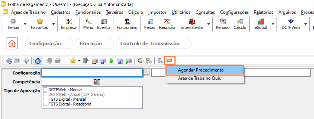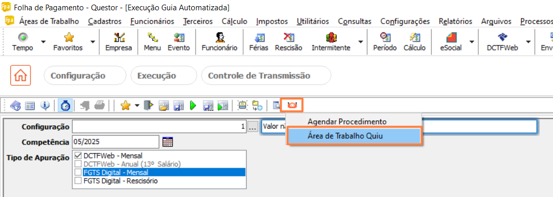 A partir da versão 22.8.0.3 para DCTFweb e 24.3.0.4 para FGTS Digital, implementamos uma nova rotina que permite a geração e envio automático da guia da DCTFWeb e Fgts Digital. Com uma simples configuração inicial, após realizar os fechamentos mensais, o Questor fará automaticamente a busca da guia da DCTFWeb no e-CAC e a geração e captura da guia do FGTS Digital Mensal no site, e o envio para o cliente por meio do eDoc.
