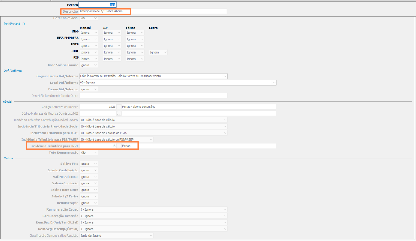 O evento de antecipação de ⅓ sobre abono estava com incidência “13”, conforme esperado.